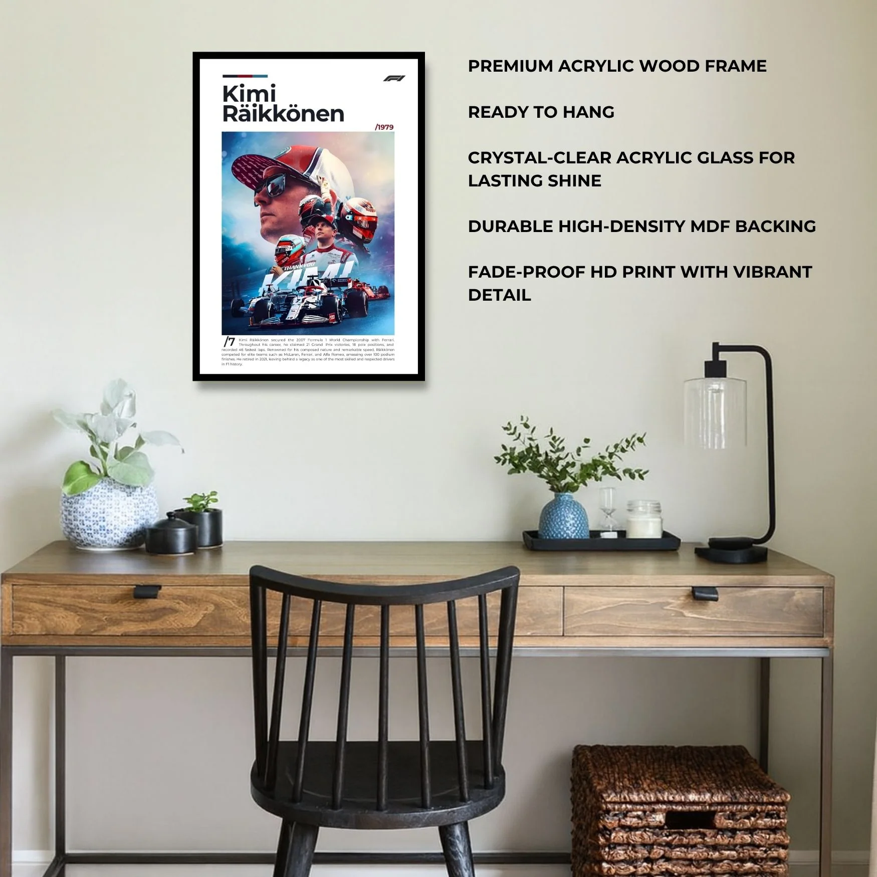 Capture the cool precision of a Formula 1 icon with Kimi Räikkönen – F1. This premium, ready-to-hang framed wall art pays tribute to “The Iceman” — a driver defined by raw talent, quiet determination, and unforgettable moments behind the wheel. Perfect for F1 enthusiasts, collectors, or interiors that appreciate calm confidence, pure speed, and the timeless spirit of racing excellence.