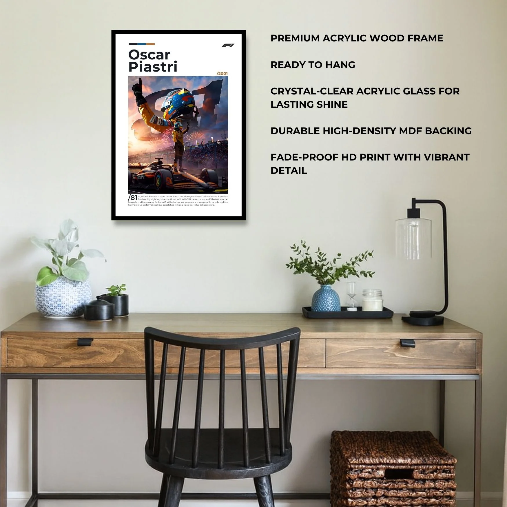 Celebrate the rise of a new Formula 1 star with this Oscar Piastri – F1 framed wall art. A premium, ready-to-hang print capturing the speed, precision, and passion of McLaren’s young talent. Perfect for F1 fans, modern interiors, gaming setups, or motorsport-inspired workspaces.