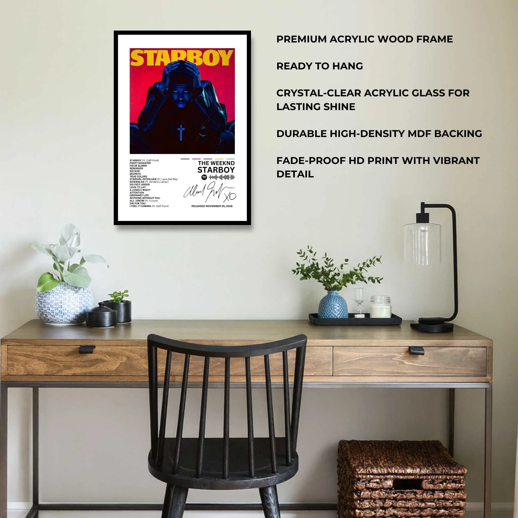 This artwork pays tribute to The Weeknd’s “Starboy”, capturing its dark, futuristic, and iconic vibe. With a bold and electric aesthetic, it reflects themes of fame, transformation, and individuality. A striking wall art piece for fans who admire style, mystery, and modern artistry.