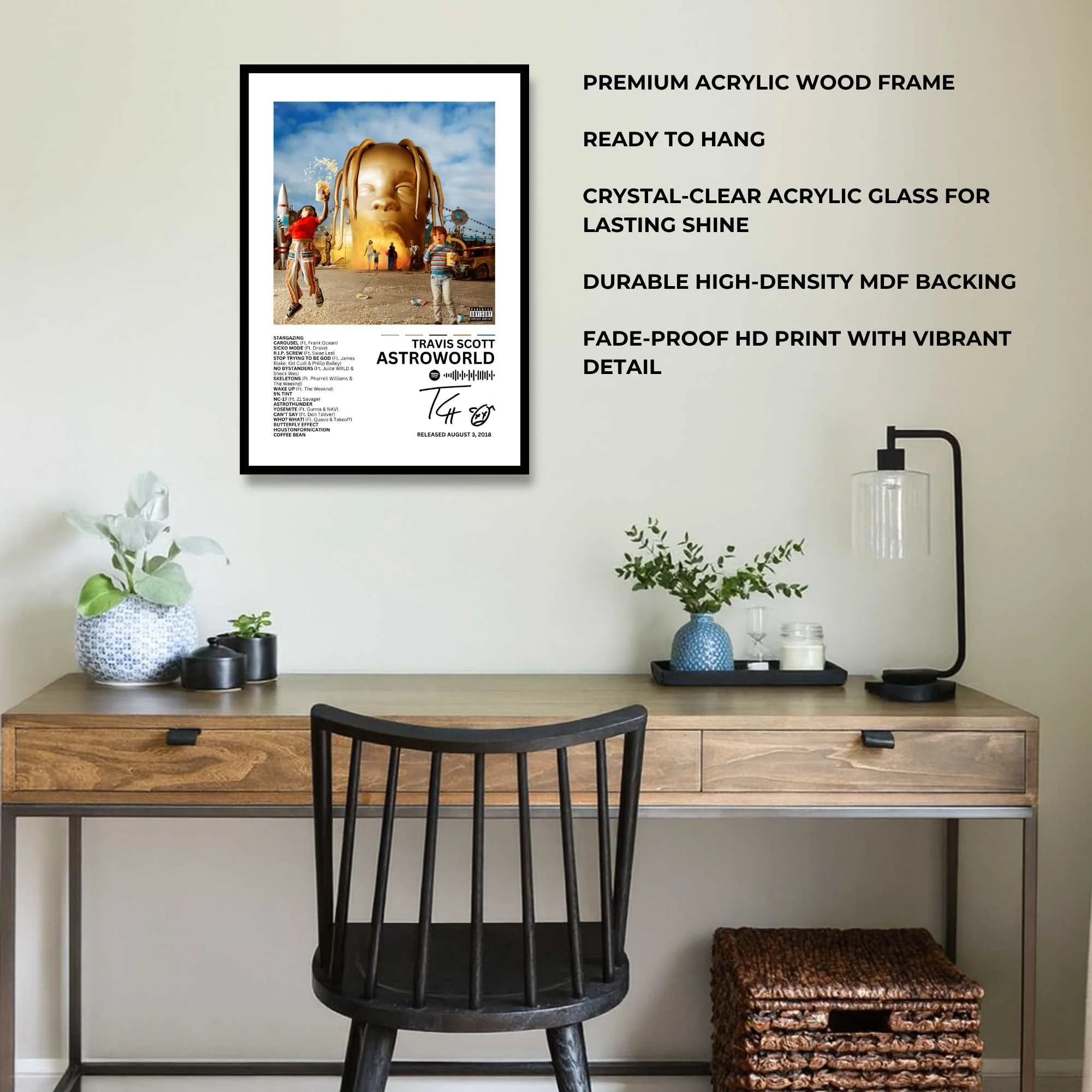 This artwork celebrates Travis Scott’s “Astroworld”, capturing its psychedelic energy and larger-than-life creativity. With a vivid, surreal aesthetic, it reflects the album’s fusion of imagination and emotion. A bold wall art piece for fans who thrive on innovation and sonic adventure.